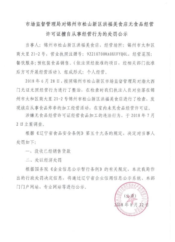 市場監(jiān)督管理局對錦州市松山新區(qū)洪福美食店無食品經(jīng)營許可證擅自從事經(jīng)營行為的處罰公示