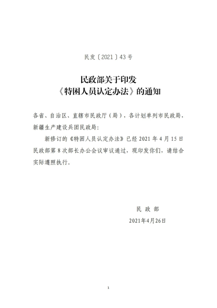 民政部關于印發《特困人員認定辦法》的通知